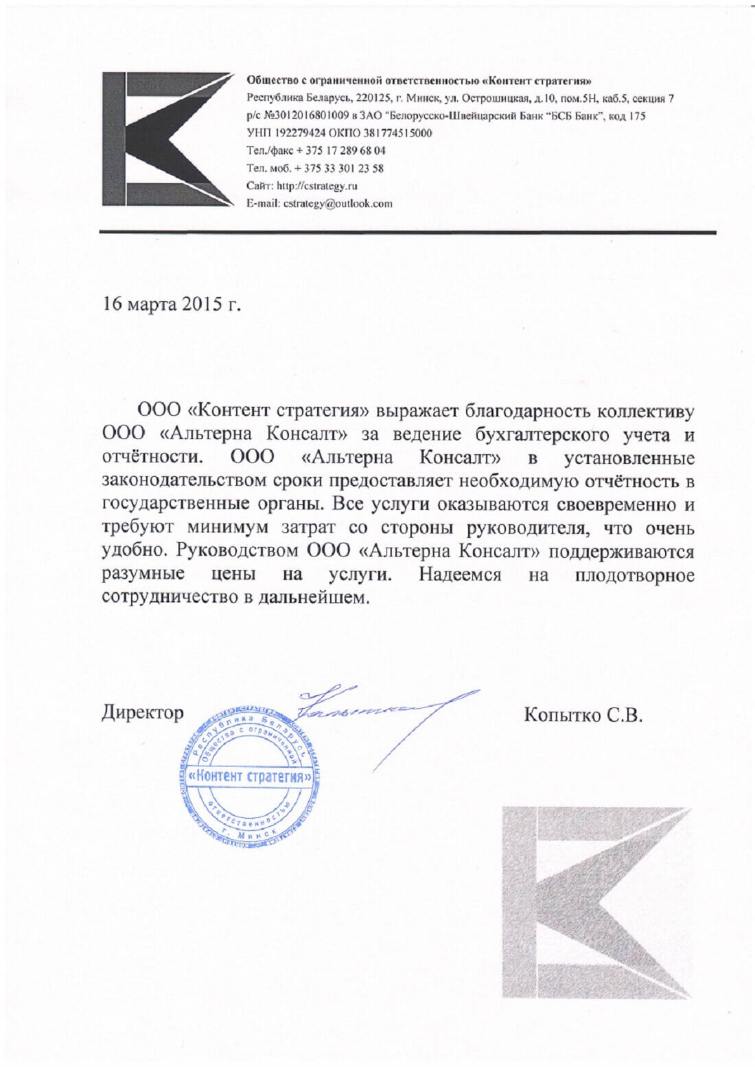 Вам будет выслан счет на оплату. В случае вновь создаваемой компании оплата производится через любое отделение Беларусбанка. Копию квитанции вышлите на адрес info@alterna.by